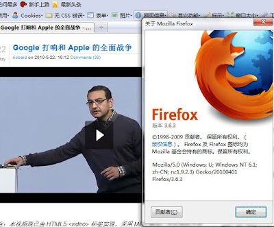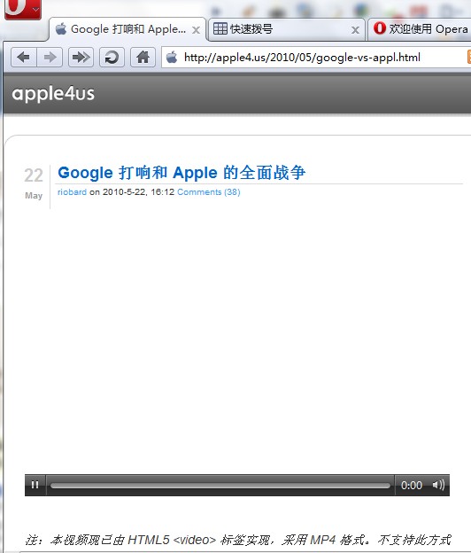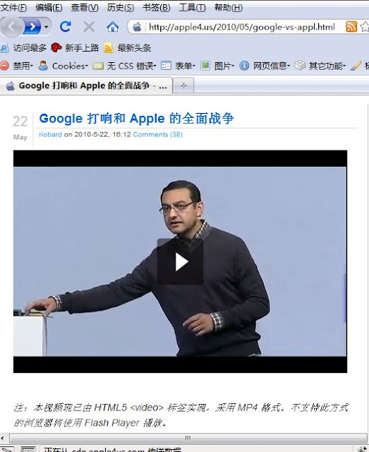 html5视频播放界面 14:45 Posted by arway html5 No comments 这是在chrome的界面显示 最刚开始阅读这个文章的时候被它的注释吸引:注:本视频现已由 HTML5 标签实现,采用 MP4 格式。不支持此方式的浏览器将使用 Flash Player 播放。便用电脑安装的ie8、 chrome4 、firefox3.6.3、opera10.53 一起打开这个含有html5的视频页面,看看效果结果在预料之中(因为技术原因可能只是暂时的): 1、都没办法只有切换到某一个时间点观看视频 2、视频的界面是不一样的:进度条、整体外观 这是在ie8 下面的环境 这是在firefox3.6.3 平台下的界面 这是在opera最新版的现实,“视频一直没播放出来” html5 标准越来越普及。虽然路还有点长,可能要2年.....4年.... 通过电子邮件发送BlogThis!分享到 X共享给 Facebook